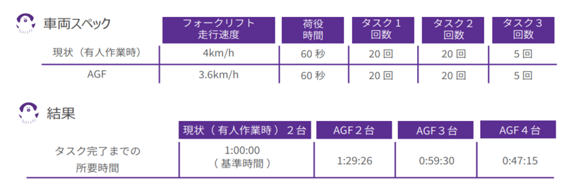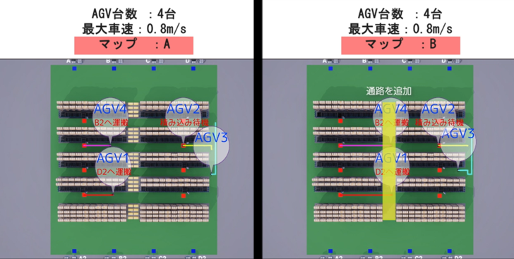 まず比較する車両スペックの差を把握し、実際の作業場所を再現した仮想環境でAGV導入時の作業性を検証していきます。今回のケースですと、友人フォークリフト2台に対し、AGVの導入台数が2台では作業性が落ちますが、3台以上からは効率が上がってくることがシミュレーションによって確認できました。このように、現状と導入時を想定比較することで最適な作業条件をご提案しました。